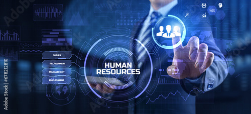 HR Human resources management Recruitment Headhunting. Businessman pressing button on screen.