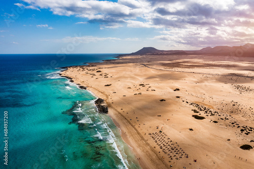 Aerial view of beach in Corralejo Park, Fuerteventura, Canary Islands. Corralejo Beach (Grandes Playas de Corralejo) on Fuerteventura, Canary Islands, Spain. Beautiful turquoise water and white sand.