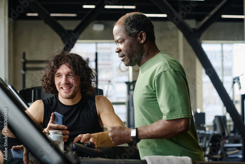 Elderly african american man and caucasian athlete checking information on treadmill screen at gym
