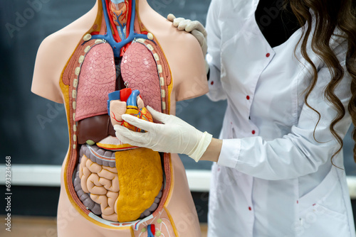 anatomy and biology teacher showing human organs on a human model