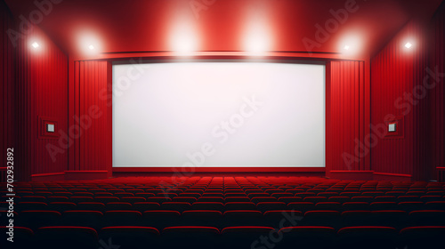 Empty cinema in red color with white blank screen. Mockup of movie theater or hall, no people and auditorium