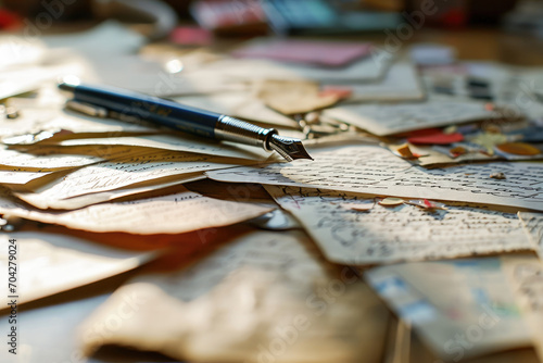 Vintage fountain pen on old handwritten letters, evoking feelings of nostalgia, history, and timeless communication.