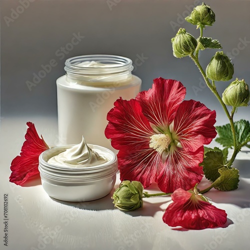 Kwiaty malwy obok słoiczka z kremem. Kwiaty prawoślazu w kosmetykach