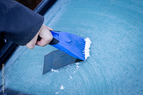 A mans hand holding an ice scraper to clear a car windscreen in winter