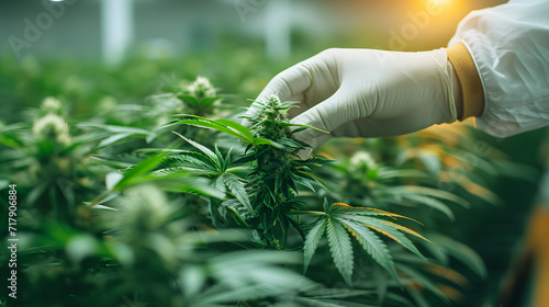 A scientist's hand close-up inspects the pleasant buds on a cannabis plant. Cannabis plantation