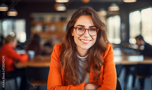 portret pięknej kobiety w okularach, uśmiechniętej, nauczycielka, jasna klasa w tle