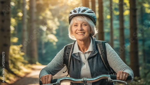 Seniorka jadąca na rowerze przez las