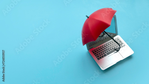 Computer and network security concept. Red umbrella cover the laptop over a blue background.