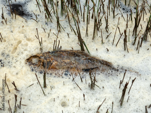 Dead fish perch in the foam. Poisoning of marine fauna, many dead fish on the beach coast