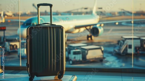 A black travel suitcase stands at the airport, an airplane is in the background. Tourism and travel concept