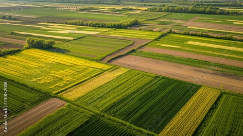 Aerial top view of panorama seen from above of the plain with the cultivated fields divided into geometric shapes in spring background, copy space
