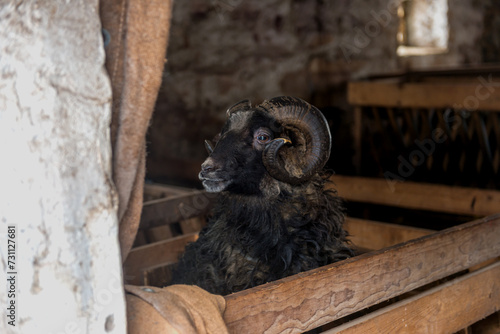 czarny baran z ogromnymi rogami w zagrodzie