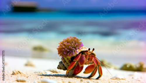 A hermit crab carrying an anemone on its shell, walking along a sandy beach with the ocean in the background.