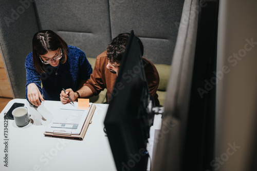 Two business professionals working earnestly at a white desk in a contemporary office setup, deep in discussion over paperwork.