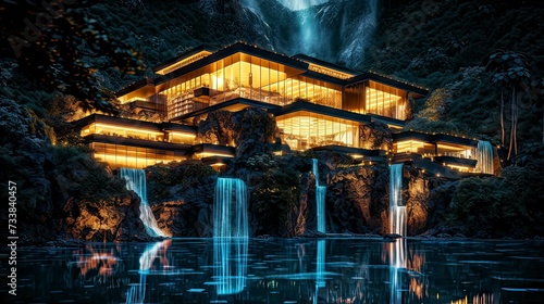 AI generated illustration of a stunning high tech modern building situated near a waterfall