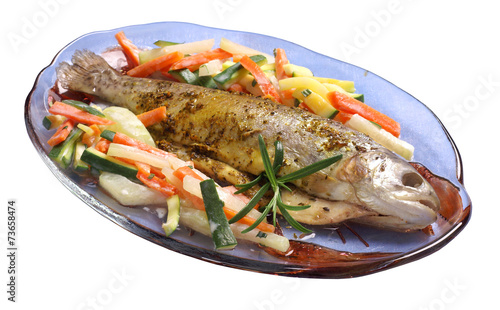 Trout baked with tarragon on a white background