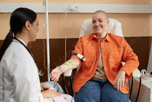 Portrait of smiling bald woman receiving chemotherapy treatment in procedure room at clinic and talking to nurse
