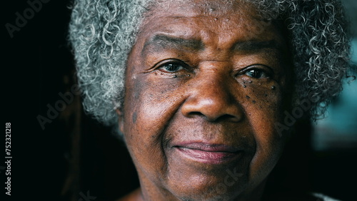 One serious black elderly lady looking at camera showcasing experience and wisdom. African American senior 80s woman with wrinkles and gray hair portrait face close-up