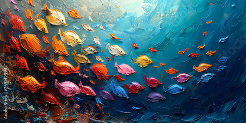 An abstract oil painting featuring a school of colorful tropical fish swimming in a vivid, textured underwater scene..