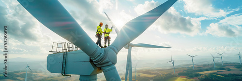 Engineers assembling wind turbines in a wind farm, harnessing wind power to generate clean and renewable electricity.