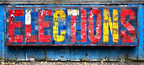 Bright ELECTIONS sign against a blue wall. Concept of election campaign, political events, voting awareness, public message, democratic process, and call to action. Banner