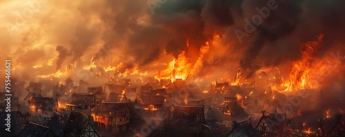 Medieval village ablaze Viking attack scene depicted . Concept Historical Reenactment, Viking Invasion, Dramatic Setting, Creative Photography