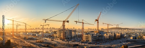 A crane and a building under construction against a blue sky background. Builders work on large construction sites, and there are many cranes working in the field of new construction.