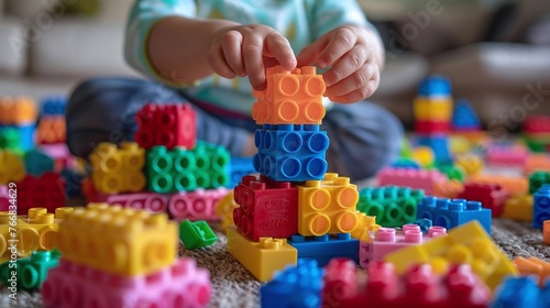 engaging in creative play, child's hands constructing tower with plastic building blocks, fostering imagination