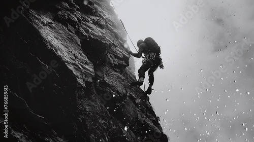 man exhibiting unwavering strength and power while climbing a steep mountainside, showcasing determination and the spirit of never giving up