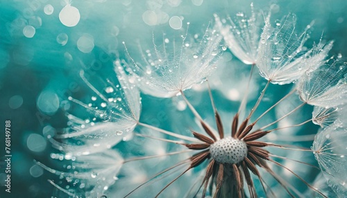 Dandelion Seeds in droplets of water on blue and turquoise beautiful background with soft focus in nature macro.