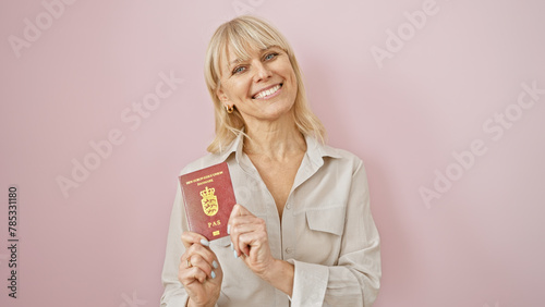 Smiling blonde woman holding danish passport over pink background showcasing travel and identity