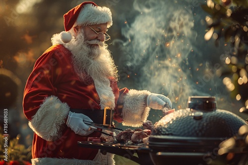 Photorealistic image of Santa Claus barbecuing outdoors, surrounded by summer scenery and barbecue grill 01