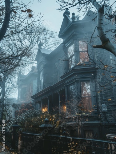 A Victorian mansion, shrouded by dense, cloudy skies, with bare trees swaying in the mist and foreboding air