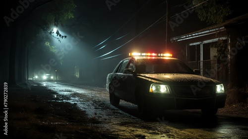 Cinematic night shot of a lone security patrol car with its lights casting long shadows, symbolizing oversight and protection, perfect for a private security service commercial