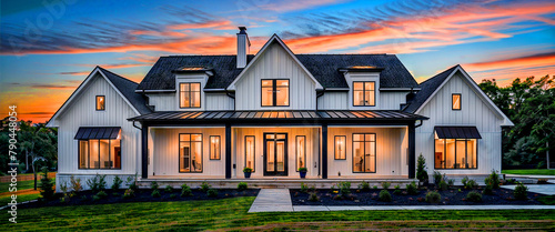 Beautiful modern farmhouse style luxury home exterior at twilight
