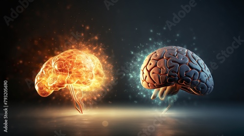 A fiery brain in a hot atmosphere opposes a frosty brain in a cold setting, symbolizing emotional and rational thinking