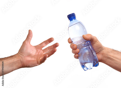 Dando de beber a alguien.sujetando botella de agua mineral.