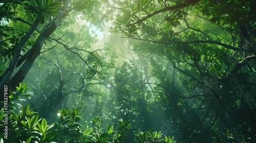 lush green forest canopy with sunlight filtering through, highlighting the beauty of mangrove ecosystems.
