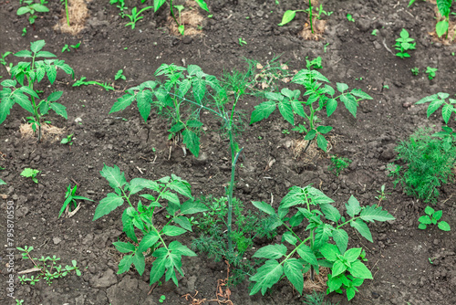 Young tomato plants growing in the garden. Growing vegetables in the garden