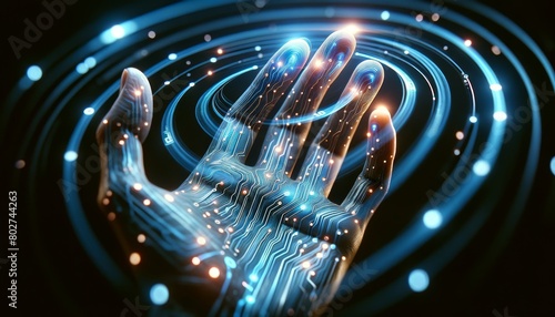 A hand with light circuits running through the skin, fingertips touching a glass surface causing ripples of digital code.