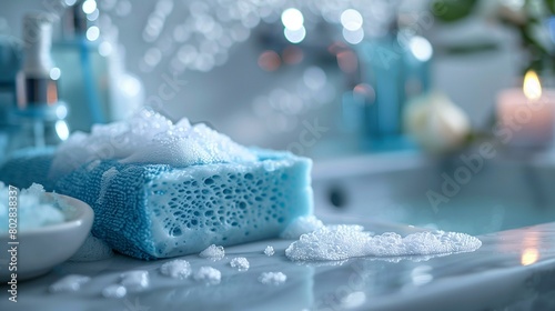 Recreational hygiene concept, blue bath sponge and blue candle, healthy lifestyle beauty soap dispenser care home interior