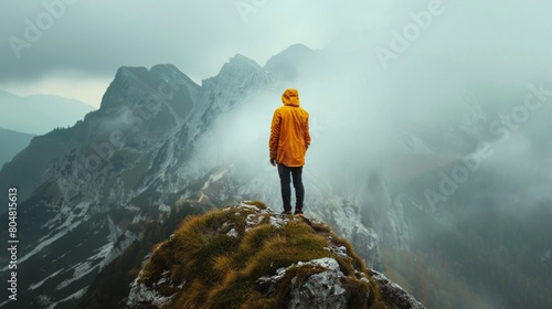 Breathtaking mountain view as seen through the eyes of a man standing on the summit, embracing the beauty of nature.