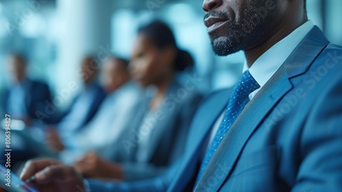 The image shows a group of businesspeople viewing graphs on digital tablets