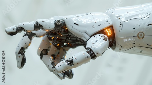 The hand of a white cyborg robotic hand is pointing a finger. The hand is rendered in 3D and isolated on a free PNG background.
