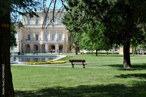 Pusta ławka stojąca w parku przy alejce na tle palacu
