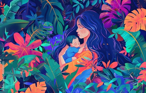día de la madre. Ilustración de madre con bebe. fondo con hojas tropicales