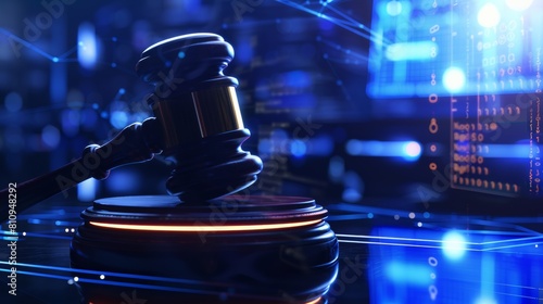A courtroom gavel in a modern digital jurisdiction concept, AI and digital technology challenges with legal compliance