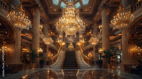 luxurious lobby featuring grand chandelier hanging from high ceiling, showcasing opulent interior design