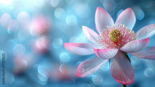 A close-up of a pink flower with water droplets on its petals and a blue boke in the background