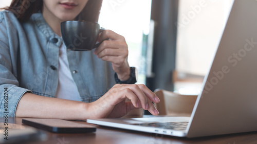 Asian business woman drinking coffee during online working on laptop computer at coffee shop, taking a coffee break, surfing the internet, business casual, freelance lifestyle, remote work